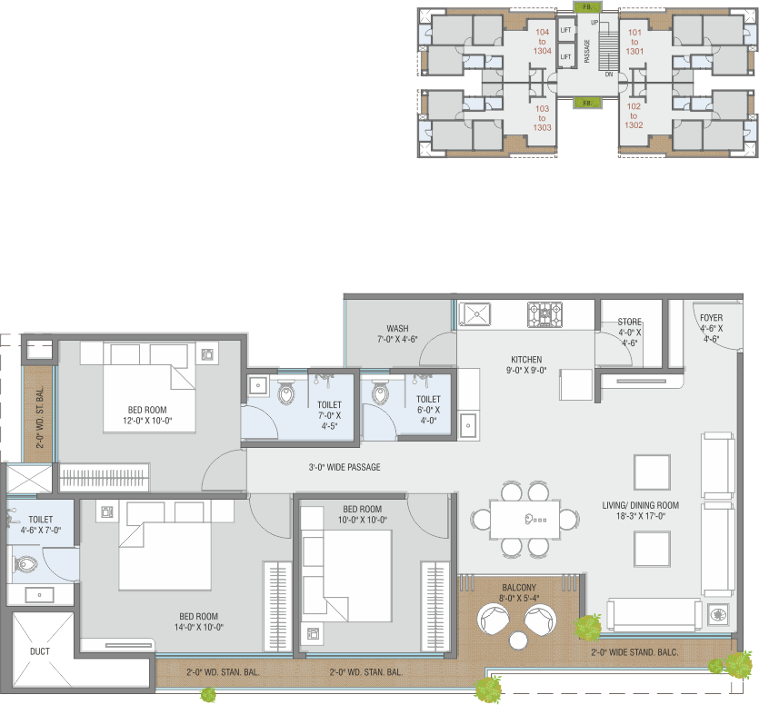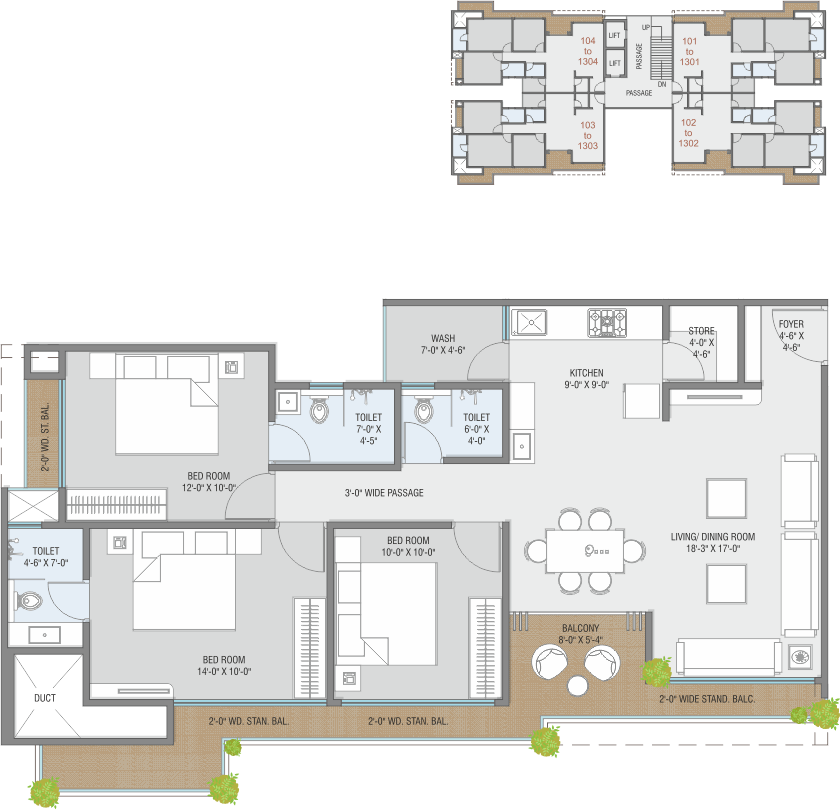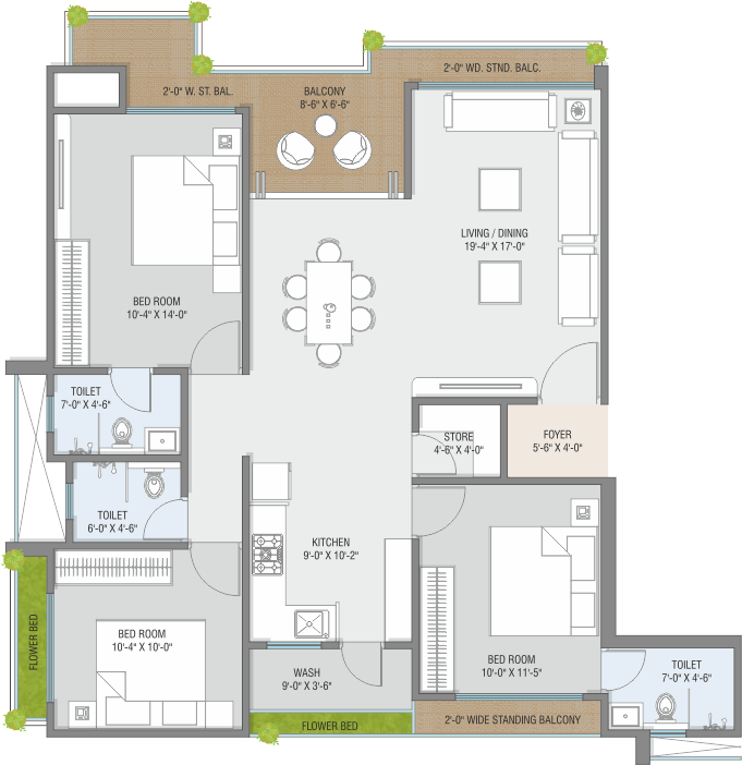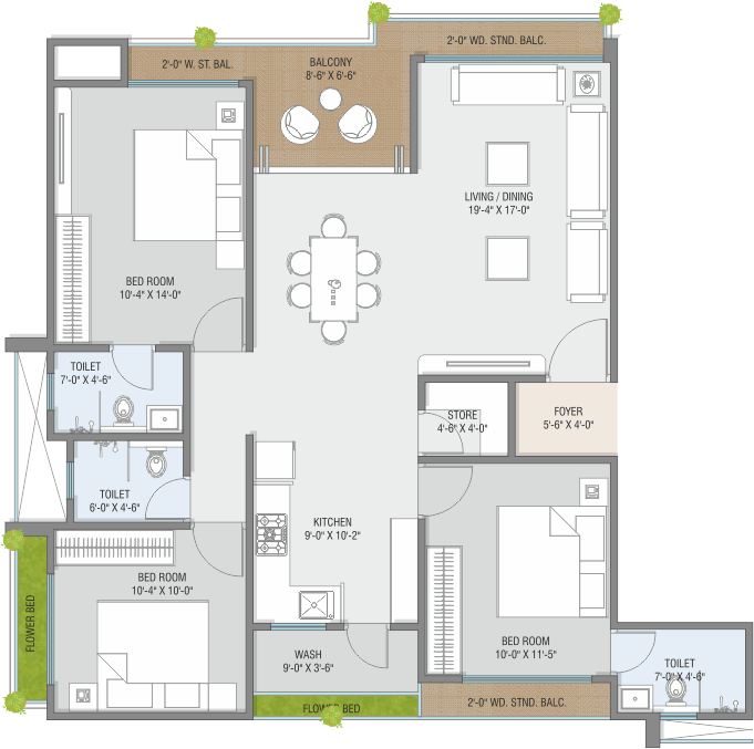 • Anti-skid flooring in Bath, Wash and Balcony.