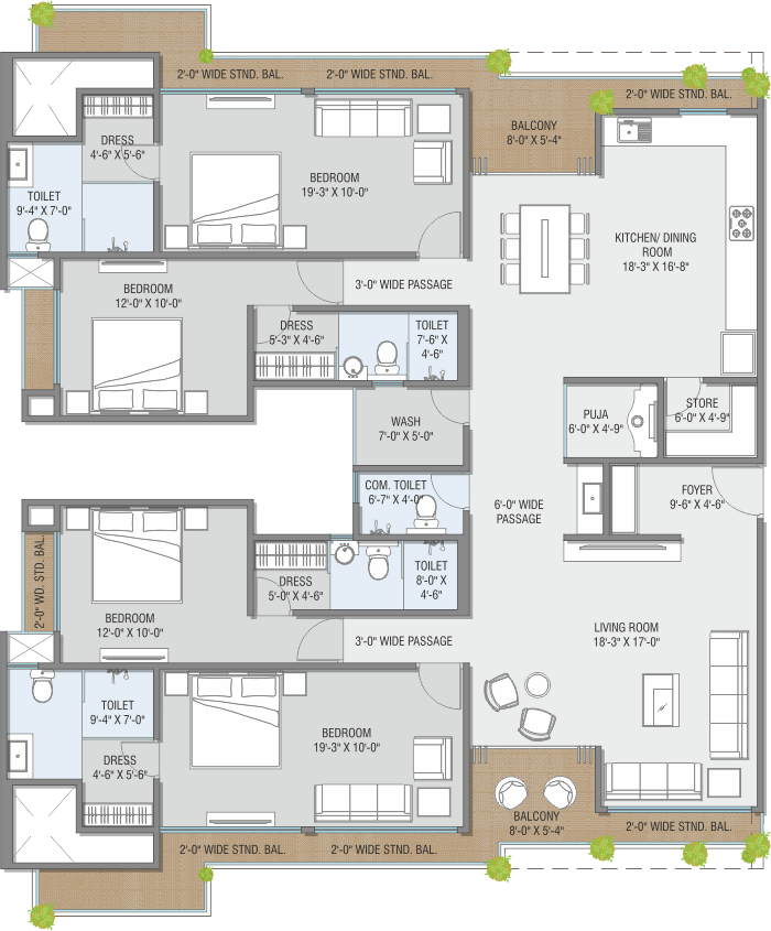 • 600mm X 1200mm premium quality glazed vitrified tiles in Living Room, Family Sitting, Kitchen, Dining and Passage with skirting.